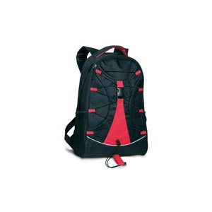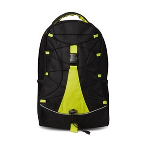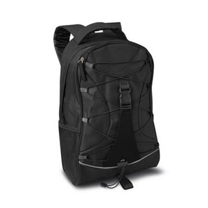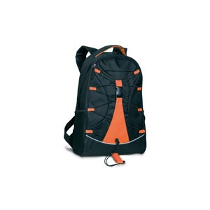 Black backpack with colourful accents in 600D polyester and drawstring cord on the front panel. Mesh pockets on both sides.