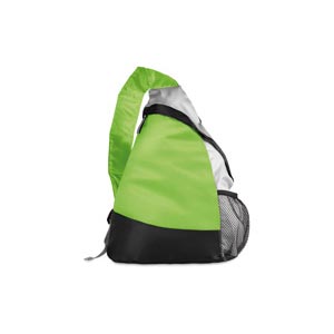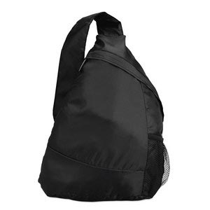 Super light triangular multicolour backpack in 210D polyester with mesh side pocket.