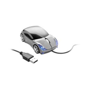 Optical mouse in stylish car shape, featuring blue lights when in use. ABS casing with metallic matt finish. 800dpi.