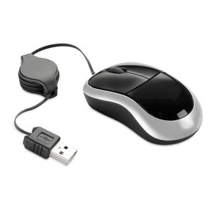 Mini retractable optical mouse in metallic colours and shiny finish, presented in velvet travel pouch. 800 dpi.