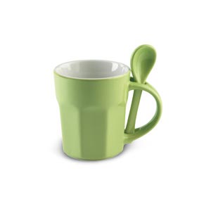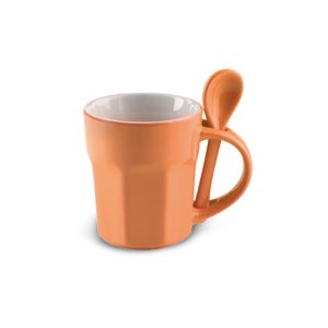 Ceramic mug with hexagonal base and integrated spoon. 300ml capacity.