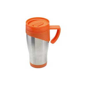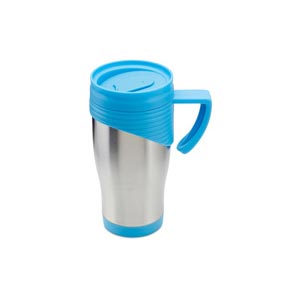 Stainless steel travel mug with plastic handle. 455 ml capacity.
