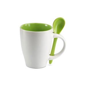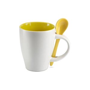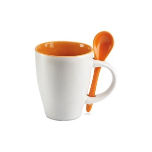 Bicolour ceramic coffee mug with colour matching spoon, 250 ml.