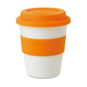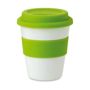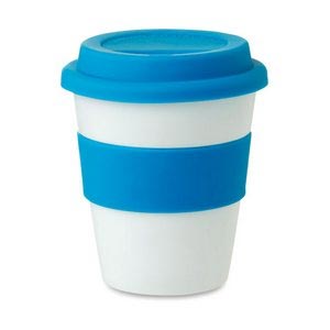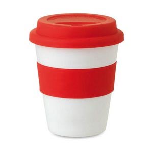 Single wall tumbler in shiny white PP with silicone lid and middle ring. Capacity 350ml.