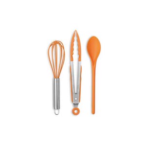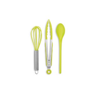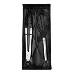 Set of 3 kitchen tools packed in black gift box. Includes egg whisk, tongs and hard PU spoon.