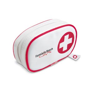 First aid kit. Includes 1 pair of scissors, 3 pad bandages, 1 roll of cotton, 2 cleaning tissues, 5 adhesive bandages, 1 roll of tape and 6 cotton buds.