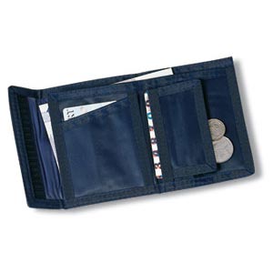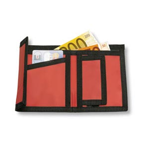 Bright coloured wallet with various compartments in 70D polyester with PVC backing.