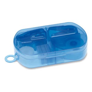 Must-have stationery set including tape dispenser, mini stapler, mini hole punch, 300 staples and an adhesive tape roll. Presented ina compact translucent plastic box.